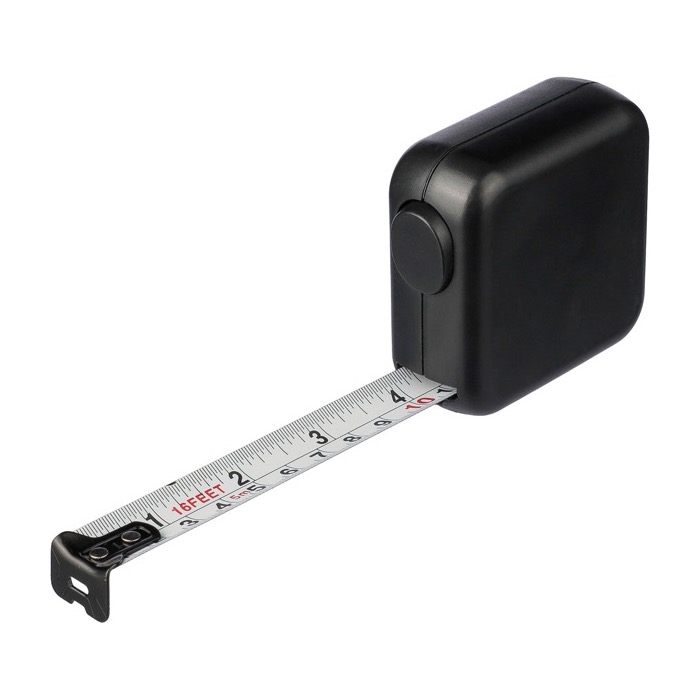 Flessometro in ABS (5 metri). Nastro in metallo (19 mm). Assemblaggio a ultrasuoni (senza viti). Pulsante di blocco. Sistema metrico in cm e pollici. Confezionato in scatola di cartone marrone.