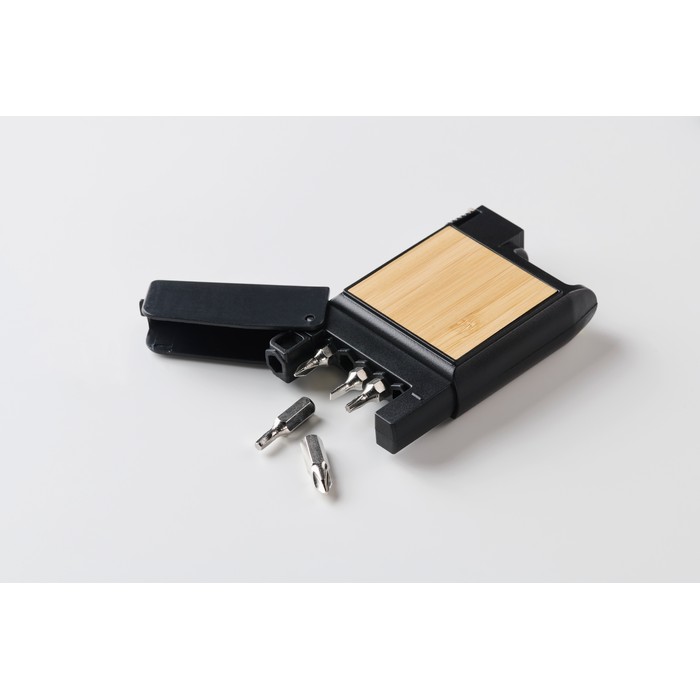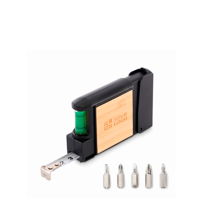 Metro a nastro retrattile multifunzionale da 3 metri con scocca in plastica con dettaglio in bambù. Include una livella a bolla e un cacciavite di metallo con 5 punte: a stella, a testa esagonale, a testa piatta e 2 a croce.