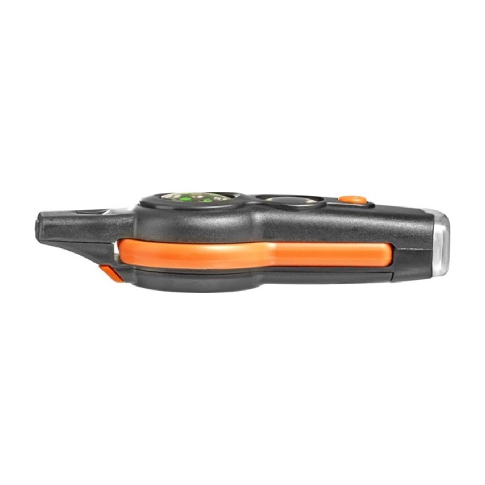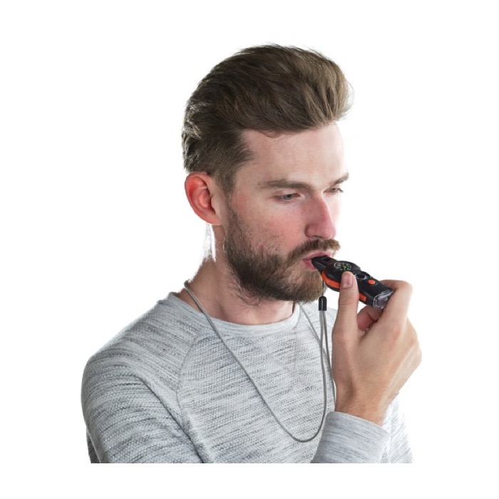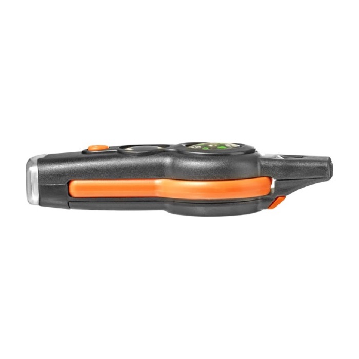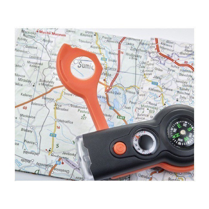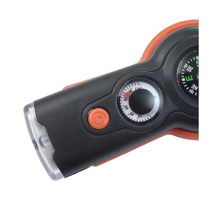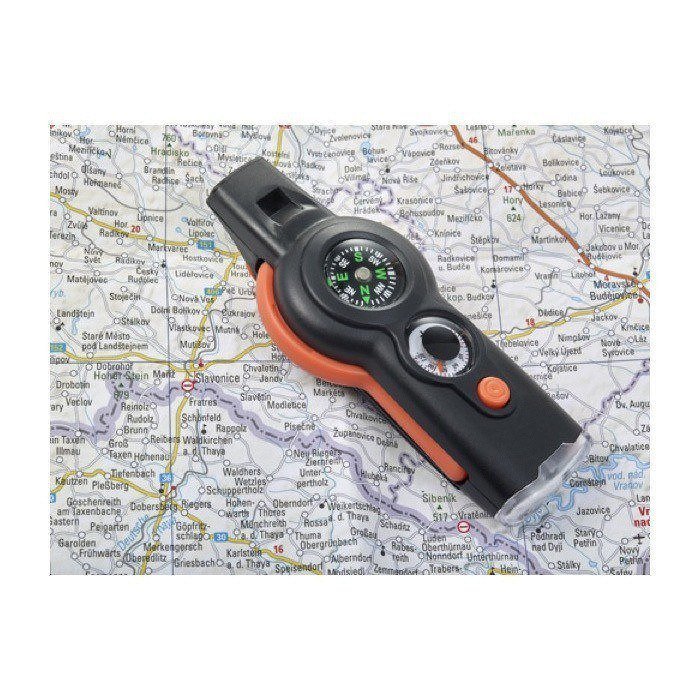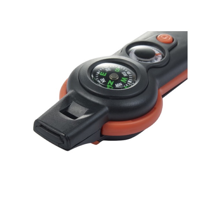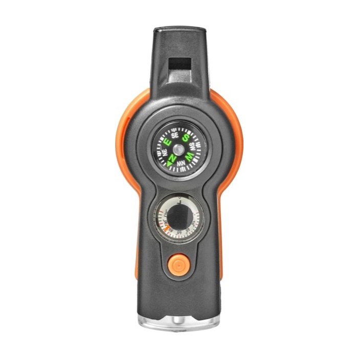 Strumento d'avventura multifunzione, comprende fischietto, bussola, termometro F°, luce, specchio, lente, cordoncino con sgancio di sicurezza e dispositivo antisoffocamento.