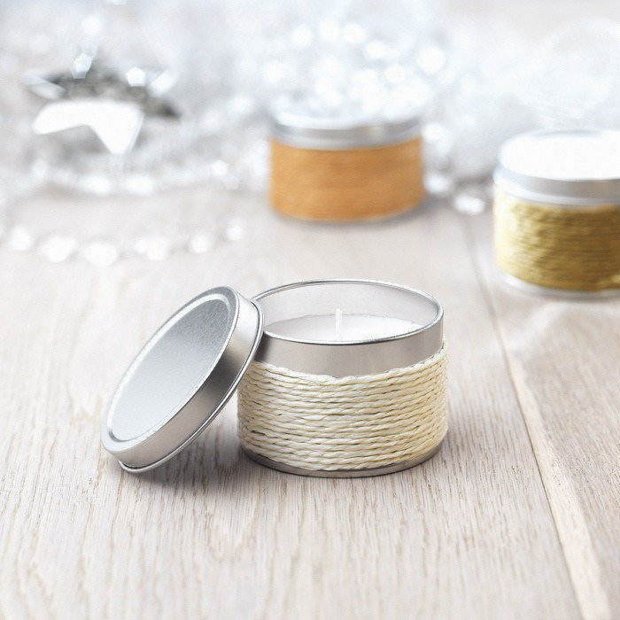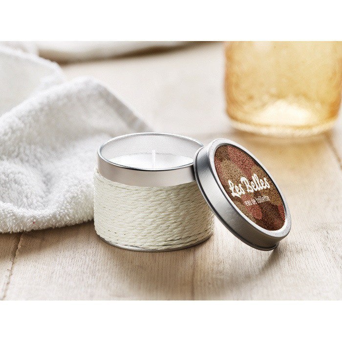 Candela profumata in confezione di alluminio con cordoncino naturale. Ogni colore corrisponde a una fragranza differente: