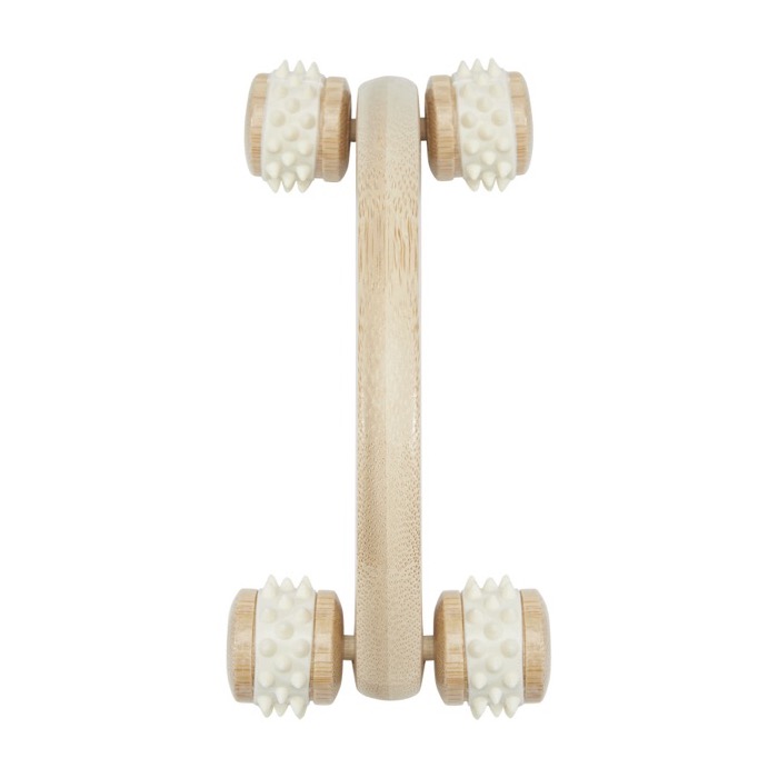 Massaggiatore in bambù con ruote in PVC, appositamente progettato per essere utilizzato su varie parti del corpo, come le braccia, le gambe, i glutei, le cosce, il busto e l'addome. Allenta la tensione muscolare, migliora la circolazione sanguigna, riduce le nevralgie, elimina l'affaticamento e aiuta a mantenere i muscoli sani. Il bambù utilizzato è ottenuto e prodotto in base a standard ecosostenibili.