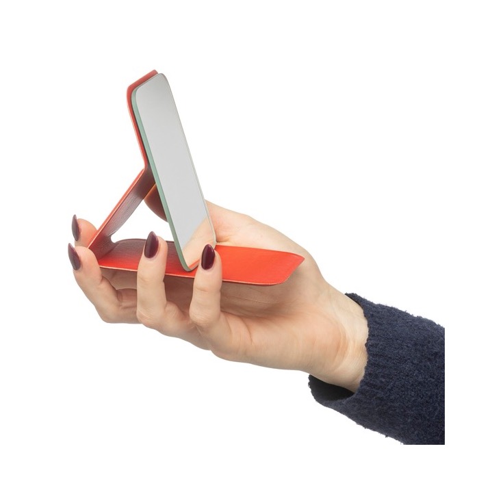Specchio in vetro con custodia pieghevole in pelle sintetica riciclata, progettato per essere portato in borsa o in tasca con il minimo ingombro. Una volta aperta, la custodia funge da supporto da tavolo per facilitarne l'uso. Il formato 70 x11 cm offre una superficie riflettente ampia e comoda; il prodotto è disponibile nei colori nero, bianco e rosso. Viene fornito in una bustina di carta individuale, ideale per la distribuzione manuale. Consigliato per attività di branding durante fiere e campagne nei settori beauty o retail.