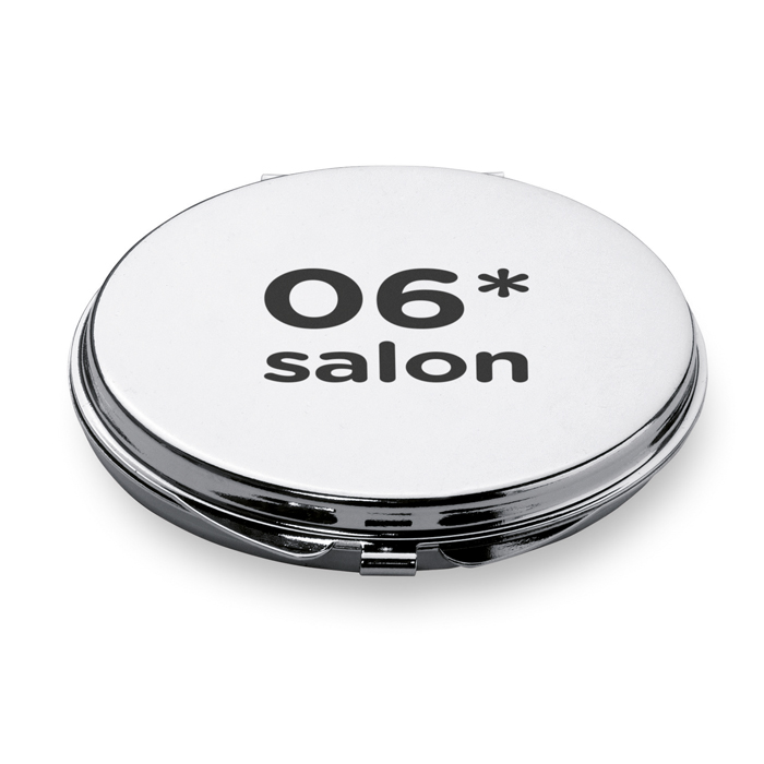 Questo specchietto in metallo cromato personalizzato per il mercato promozionale è doppio (uno dei due è ad aumento) e si presenta con una custodia.