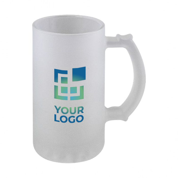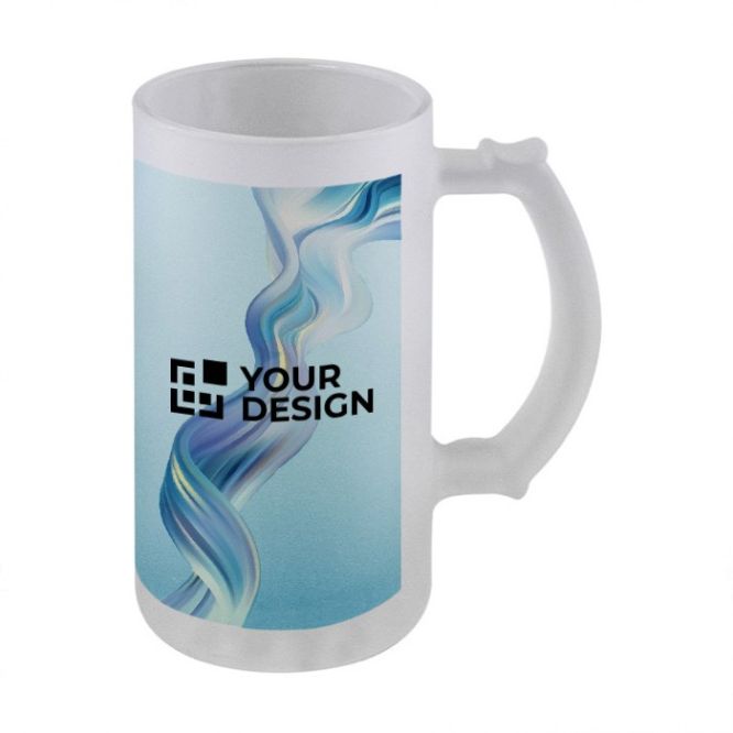 Completa il merchandising della tua attività di ristorazione con questo divertente boccale da birra con finitura effetto ghiacciato. Realizzato in vetro e progettato per la sublimazione, può essere personalizzato con il tuo logo a colori, aumentando così la visibilità del marchio ad ogni sorso. Ha una capacità di 500 ml, manico ergonomico e si consiglia il lavaggio a mano. Conforme alla normativa europea per prodotti a contatto con alimenti e bevande. Non idoneo al congelamento.
