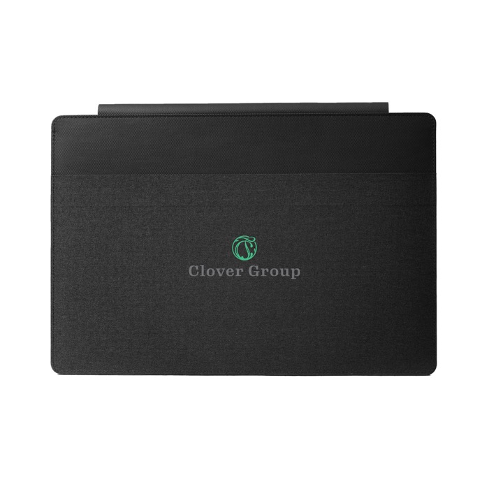 Protezione e comfort per il tuo laptop con questa custodia in tessuto riciclato che si trasforma in supporto con inclinazione di 4 cm. Ha una tasca posteriore.