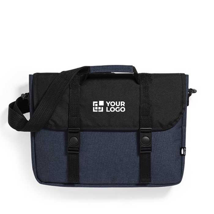 Cartella portadocumenti realizzata in resistente poliestere 600D RPET riciclato e senza PVC, risultato dalla combinazione del processo di riciclaggio delle materie plastiche insieme alla tecnica millenaria di fabbricazione del feltro, ottenendo un materiale eco-trend di origine riciclata. Tasca principale imbottita che si chiude con due cinghie con chiusura a fibbia. Tasca interna con zip. Tracolla regolabile e maniglia di trasporto rinforzata e fascia per agganciarla al trolley sul retro. Supporta fino a 7 kg. Presenta etichetta RPET.