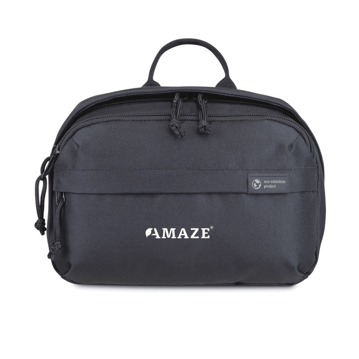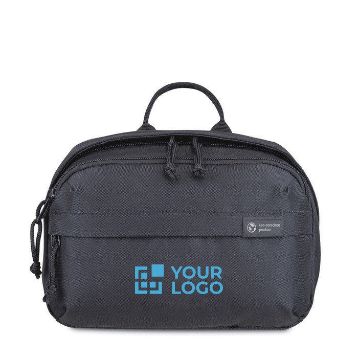 Ampio beauty case in tessuto riciclato con cinghie da bottiglie in plastica e tasche frontali con zip. Organizzazione perfetta per i tuoi viaggi di lavoro.