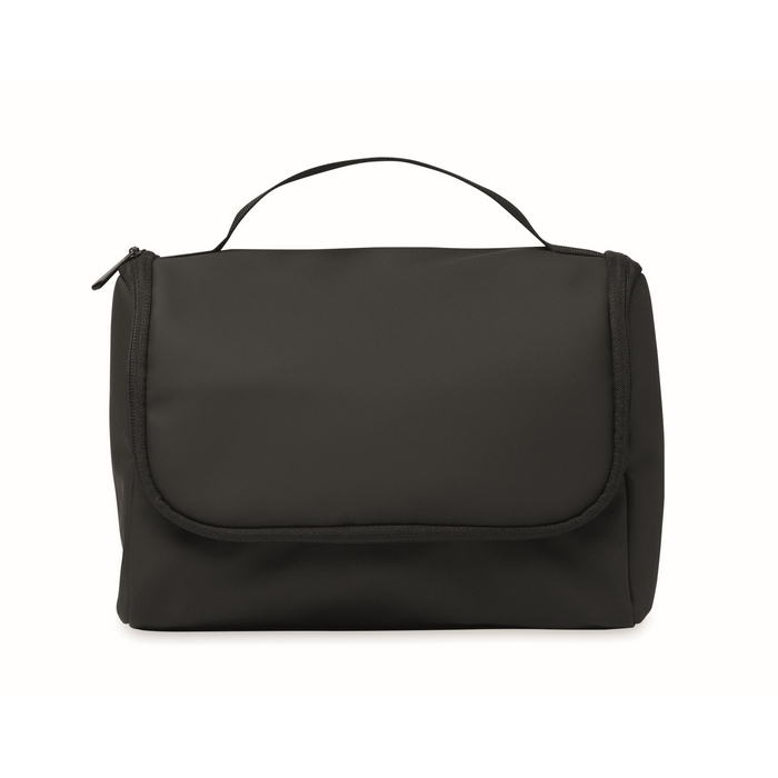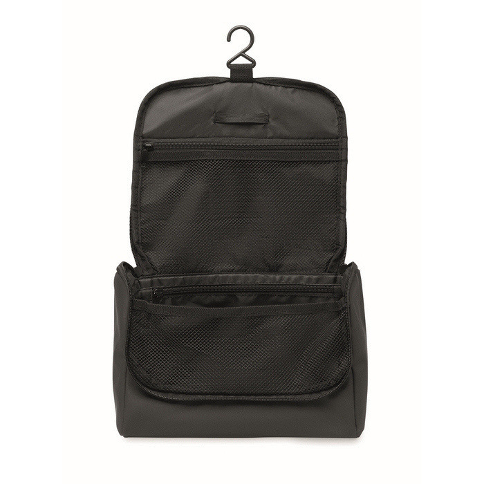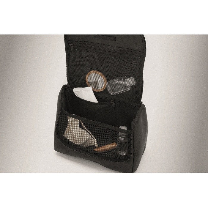 Beauty case organizzatore in morbido PU con gancio per appendere e fodera in RPET 210D. Ampio scomparto principale con interno a rete con zip e 1 comparto a rete.