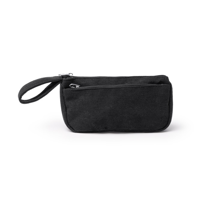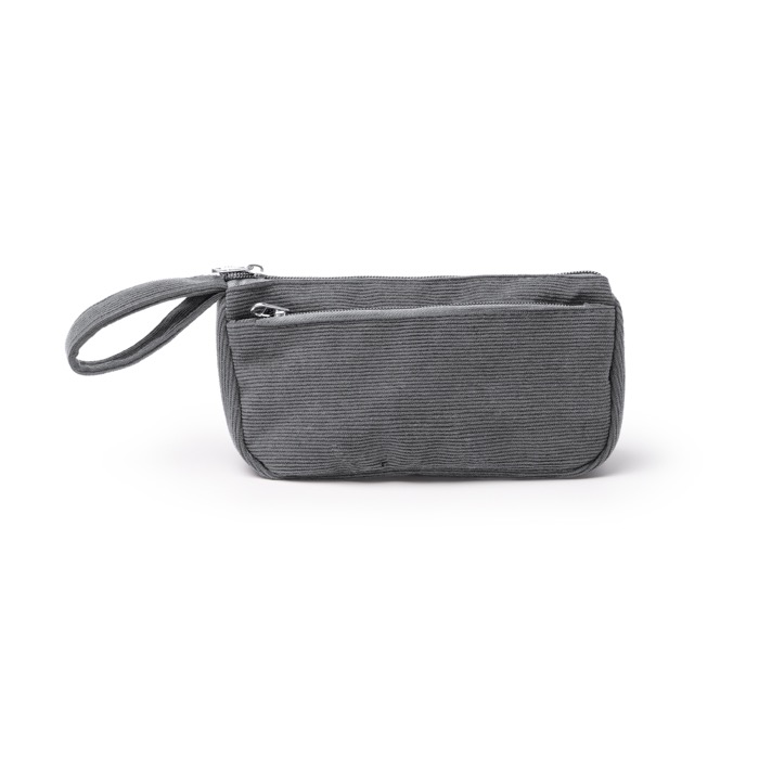 Beauty case in velluto a coste con doppio scomparto, accesso rapido e fodera resistente. Personalizzalo con il tuo logo e valorizza il brand in eventi o viaggi aziendali.