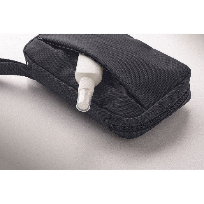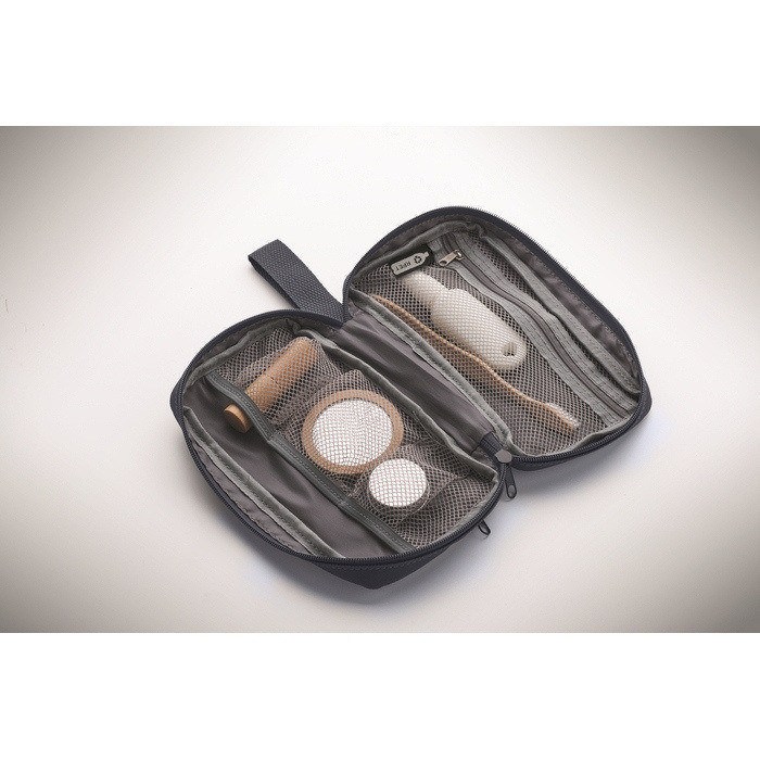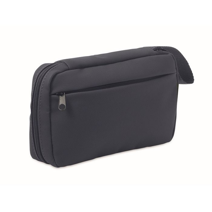 Beauty case in RPET 600D con rivestimento in PU, rete in RPET e fodera in RPET 210D, pensato per organizzare articoli da viaggio o materiale per l’uso quotidiano. Include un comparto principale con cerniera per chiudere il contenuto in sicurezza. All’interno presenta una rete e diverse tasche aperte che aiutano a separare piccoli accessori e a mantenere tutto visibile. Grazie al suo formato, si adatta bene come regalo aziendale in welcome pack, eventi o attività di merchandising.