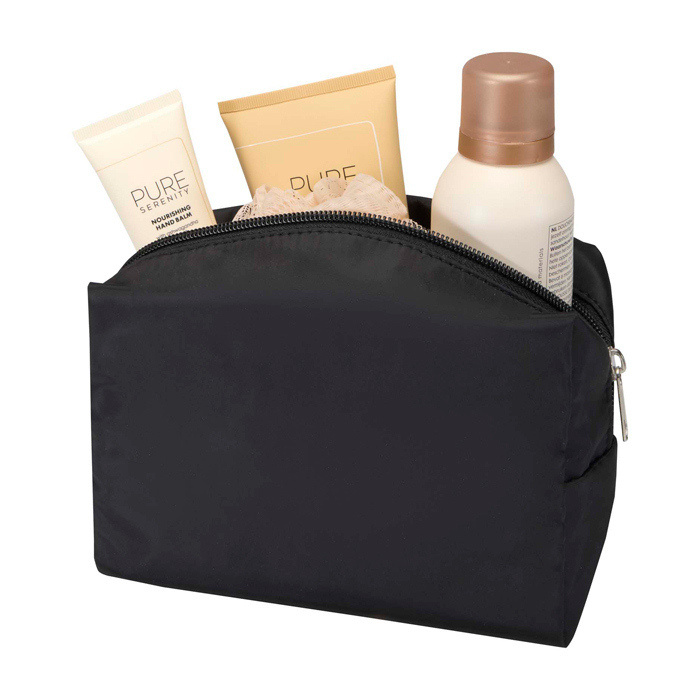 Necessaire da viaggio realizzato in poliestere riciclato con certificazione GRS (Global Recycled Standard), pensato per organizzare l’indispensabile durante spostamenti ed eventi. Il formato compatto aiuta a portare spazzolino, dentifricio, shampoo e altri piccoli articoli senza mescolarli con il resto del bagaglio. Include una chiusura a cerniera e un manico per spostarlo rapidamente o appenderlo in bagno. Un’opzione utile per iniziative di benvenuto ai dipendenti, congressi o campagne di marca con personalizzazione.