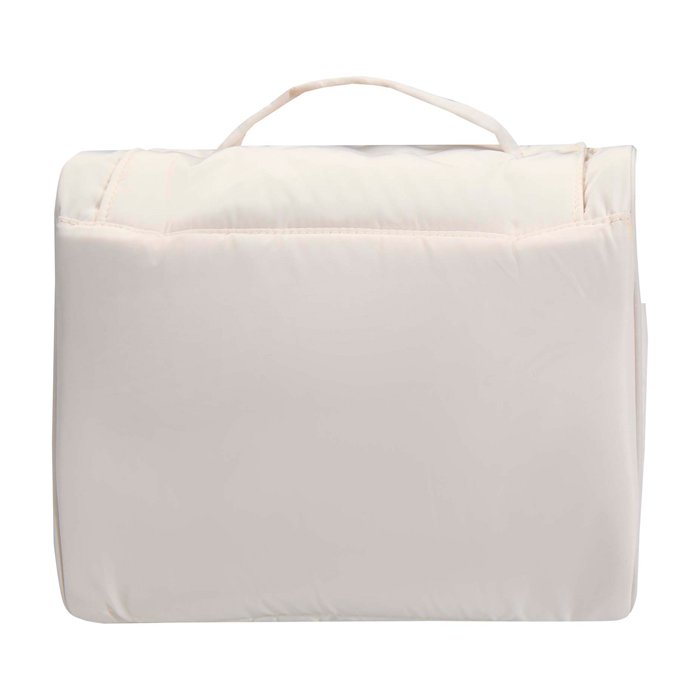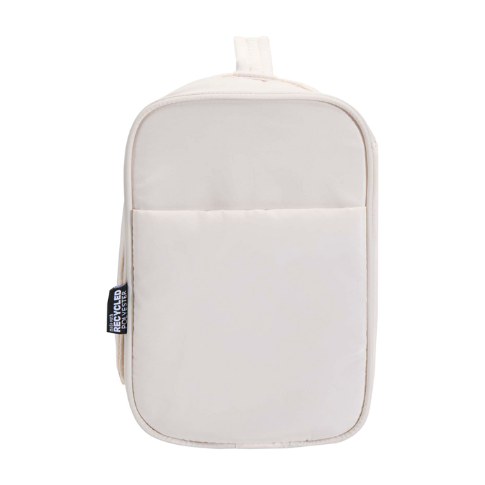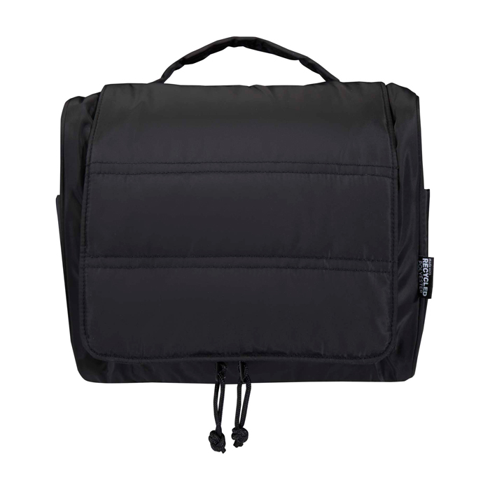 Necessaire in poliestere riciclato con certificazione GRS (Global Recycled Standard) e gancio integrato, pensato per tenere tutto in ordine durante viaggi o spostamenti. Offre una capacità di 8L e un ampio scomparto principale con sei tasche interne per separare gli accessori, oltre a due tasche laterali esterne ad accesso rapido. Il gancio consente di appenderlo a porte o portasciugamani, mentre la maniglia imbottita migliora il trasporto. La finitura imbottita offre protezione e il tessuto idrorepellente aiuta nell’uso quotidiano. Utile per attività di branding in viaggi aziendali ed eventi.