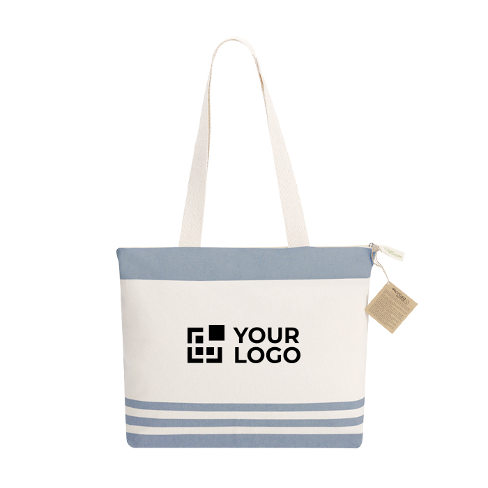Borsa in cotone riciclato da 300g/m² in tonalità naturale con design a righe orizzontali colorate, pensata per l’uso quotidiano in fiere e punti di accoglienza. Integra un soffietto sul fondo e sui lati per aumentare la capienza e mantenere meglio la forma durante il trasporto dei materiali. Include manici lunghi da 70cm con rinforzo e cuciture a vista per una presa comoda a spalla. Finitura cucita e dettagli curati per accompagnare le azioni di marca in eventi, retail o onboarding del personale.