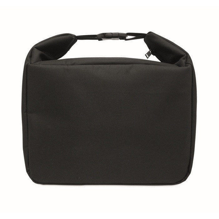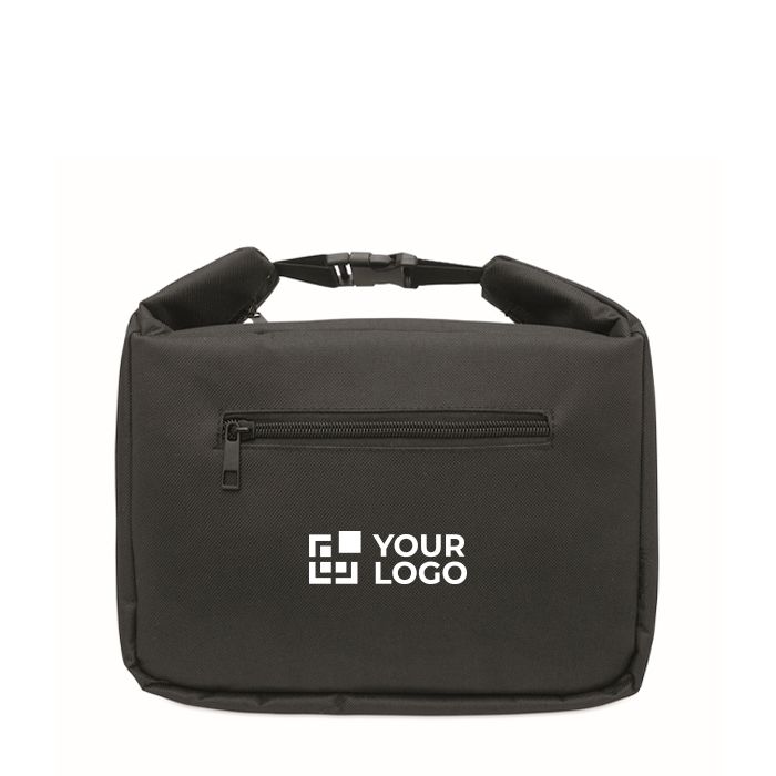 Borsa frigo in poliestere 600D RPET con schiuma PE da 3 mm e fodera interna in carta di alluminio. Integra un indicatore di temperatura per controllare a colpo d’occhio il freddo del contenuto. Include scomparto principale e tasca frontale, entrambi con cerniera, oltre a chiusura con fibbia per un trasporto più sicuro. Capacità totale di 5 litri. Consigliata per kit di benvenuto, eventi interni o azioni di incentivazione.