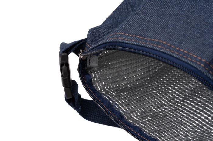 Borsa frigo in tessuto denim con interno isotermico e manico con fibbia