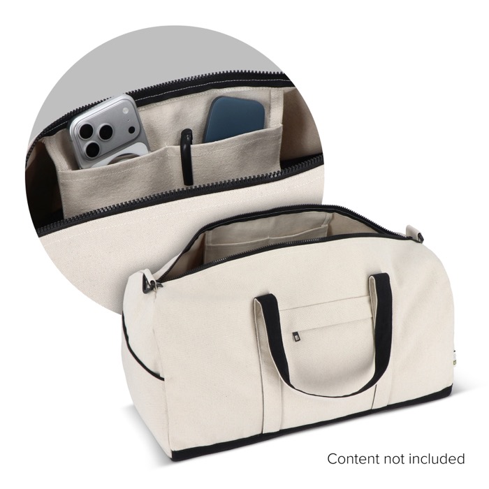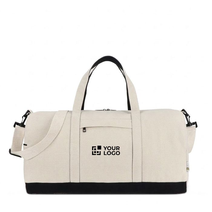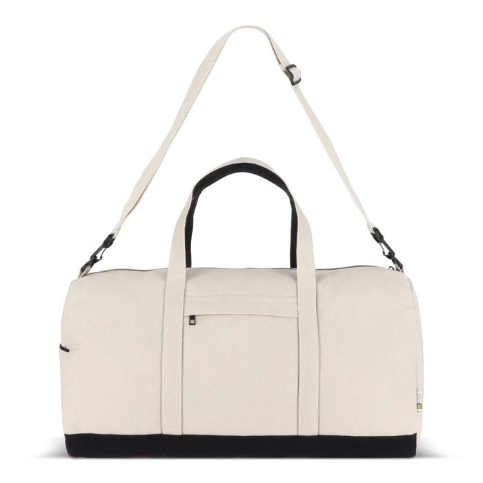 Borsa da viaggio in cotone riciclato e poliestere riciclato, pensata per spostamenti di lavoro, eventi o attività sportive. Include manici corti rinforzati e una tracolla lunga a spalla per alternare il trasporto in base al carico. La chiusura con cerniera mantiene il contenuto protetto e consente un accesso rapido. Include una tasca frontale con cerniera per gli oggetti piccoli e una tasca laterale per avere a portata di mano ciò che si usa di più. Un’opzione pratica per azioni di benvenuto, tornei aziendali o dotazioni per lo staff.