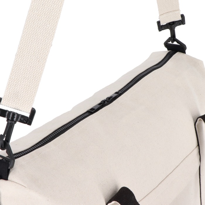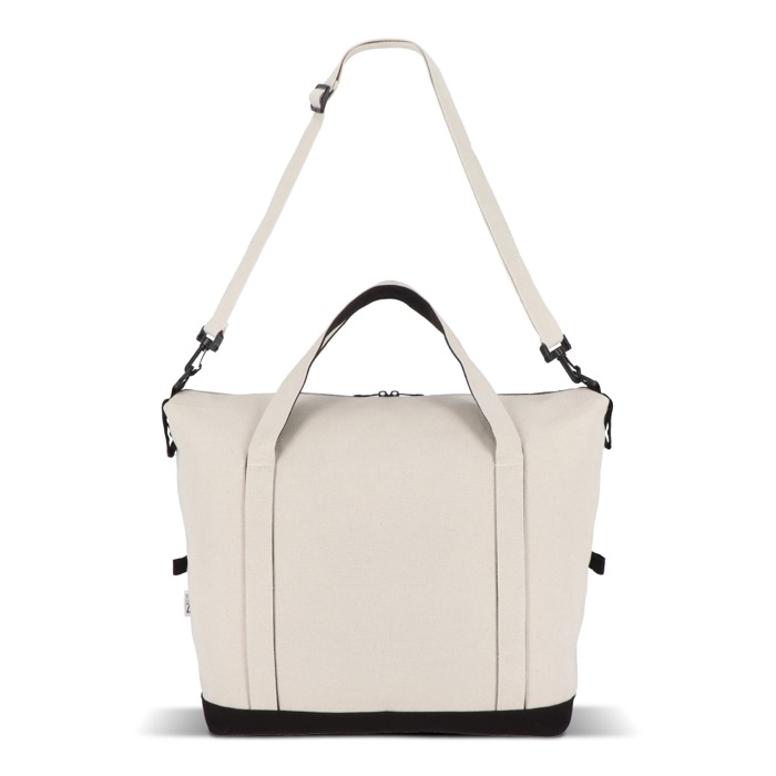 Borsa da viaggio in cotone con fibre riciclate e poliestere riciclato, pensata per gli spostamenti di lavoro e le brevi fughe. Include robusti manici a mano e una tracolla regolabile per portarla a spalla in base al peso. La tasca frontale con zip permette di avere a portata di mano documenti o accessori, mentre i due scomparti interni aiutano a separare vestiti, laptop o materiale per eventi. Finitura in colore naturale con dettagli neri. Un’opzione pratica per attività di brand in fiere, corsi di formazione o viaggi aziendali.