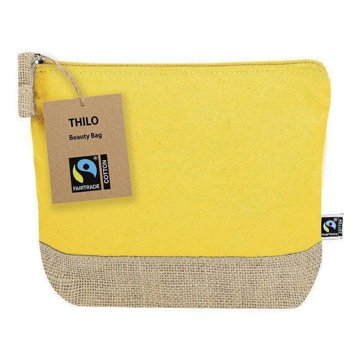 Necessaire realizzato in una combinazione di cotone e juta laminata con certificazione Fairtrade (Commercio Equo), un sistema commerciale solidale e alternativo a quello convenzionale, che persegue lo sviluppo dei popoli e la lotta contro la povertà. Include uno scomparto principale con chiusura a cerniera e tirante metallico, con base in juta di tono naturale, e si completa con una parte frontale superiore in cotone colorato. Dotato di pratico cordino per la presa. Inclusa etichetta Fairtrade e etichetta con logo in cartone riciclato.