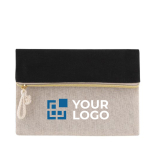 Cotone e iuta, una cerniera dorata e un tirante in corda rendono questa pochette con logo un accessorio elegante e raffinato con cui dare risalto al vostro brand.