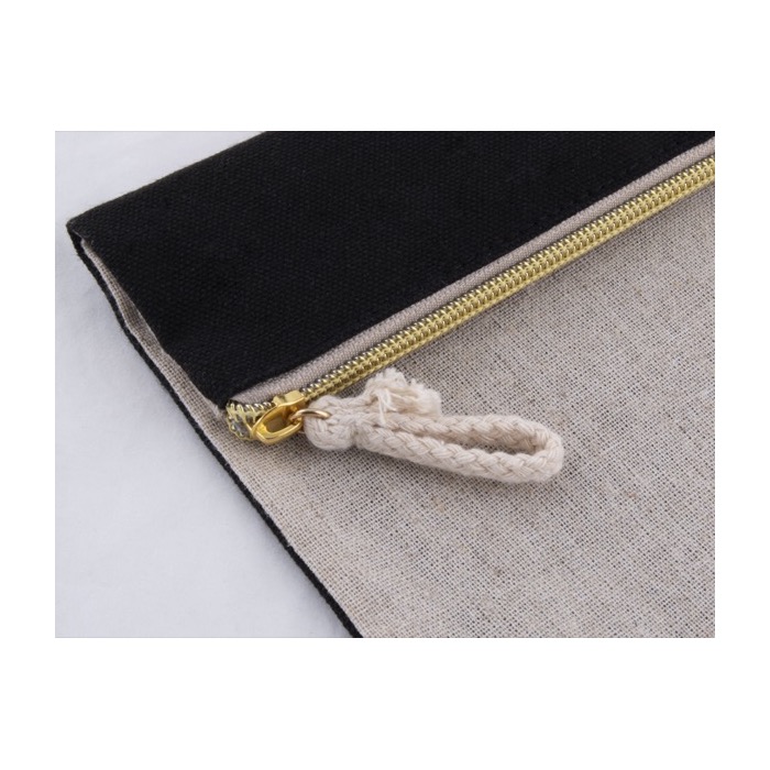 Pochette bicolore realizzato in cotone 280 gr/m² sul lato nero, e in cotone juta 180 gr/m² sul lato chiaro. Cerniera dorata e tirante in corda. PVC free.