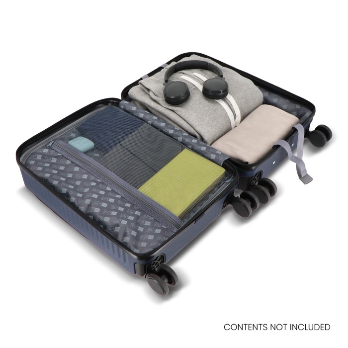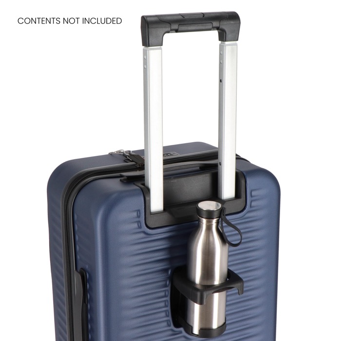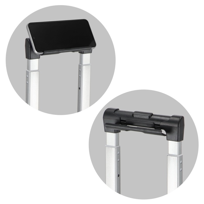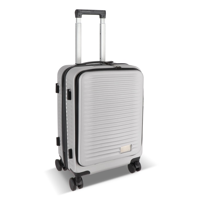 Trolley bagaglio a mano con struttura resistente e design pensato per i viaggi di lavoro. Include quattro ruote girevoli per manovrare facilmente e chiusura TSA per i controlli in aeroporto. La maniglia integra un supporto per telefono, utile per tenere a portata di mano biglietti o mappe. Sul retro include un portabicchiere e, sui lati, due ganci per appendere borsa o cuscino cervicale. Il comparto anteriore aggiunge una custodia imbottita per laptop fino a 15,6''. Adatta per trasferte di team, incentive o attività di brand in fiera.