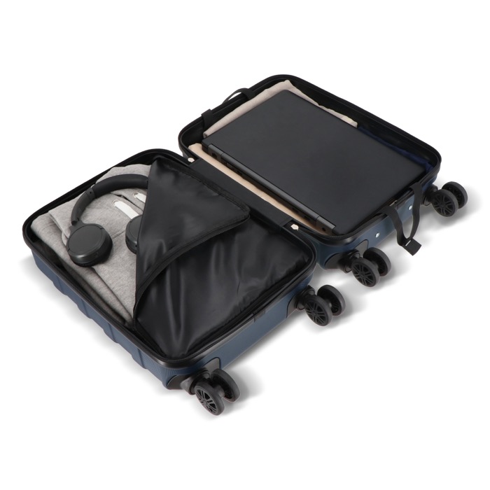 Trolley da cabina dal design compatto, pensato per viaggiare con l’essenziale ben organizzato. La misura da 18'' si adatta alla maggior parte dei vani portaoggetti superiori, aiutando a velocizzare imbarchi e spostamenti. Integra quattro ruote girevoli per manovrare con facilità, oltre a una serratura a combinazione per tenere il contenuto più sotto controllo. La maniglia integra un supporto per telefono, utile durante le attese in aeroporto, in stazione o in banchina. Opzione pratica per iniziative incentive o viaggi aziendali.