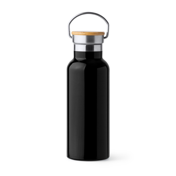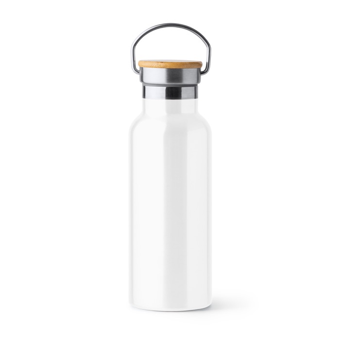 Borraccia a doppia parete in acciaio inox 304 con coperchio in bambù. Capacità 500 ml. Possibilità di sublimazione sul colore bianco. Manico pieghevole in metallo. Disponibile in un'ampia gamma di colori.