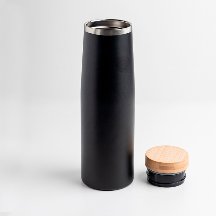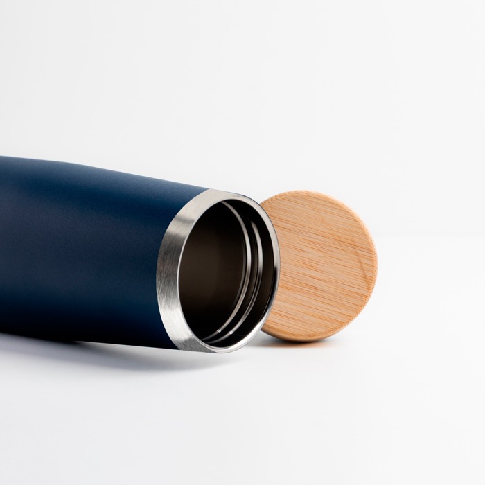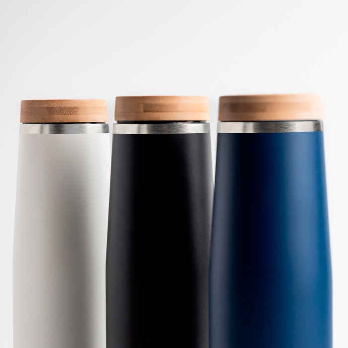 Idratazione garantita durante le giornate lavorative o le avventure all’aperto con questa borraccia termica con rivestimento a polvere e tappo in bambù.