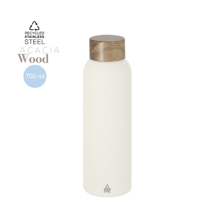 Bottiglia in acciaio inox riciclato con finitura gommata morbida, pensata per l’uso quotidiano in ufficio, in stabilimento o durante gli spostamenti. Include un tappo in legno di acacia con chiusura a vite che aiuta a mantenere una tenuta affidabile ed evita gocciolamenti nello zaino o nella valigetta. Capacità di 700 ml, dimensione comoda per idratarsi durante la giornata. Realizzazione senza BPA (bisfenolo A). Soluzione pratica per la personalizzazione con logo e la consegna in iniziative interne, eventi o merchandising aziendale.