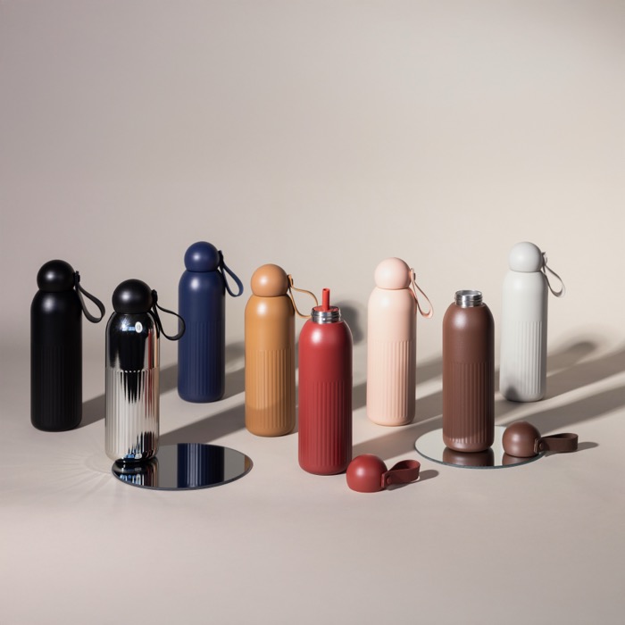 Bottiglia termica in acciaio riciclato con isolamento sottovuoto e rivestimento in rame: mantiene bevande calde 12h o fredde 24h senza condensa. Strisce verticali, tappo rotondo in plastica riciclata e cannuccia staccabile. Lavabile in lavastoviglie.