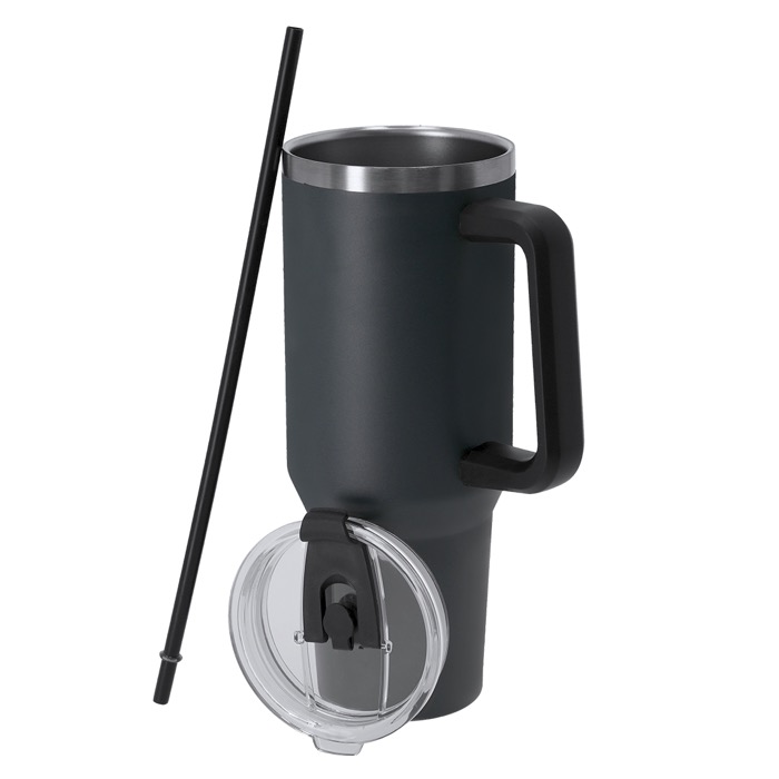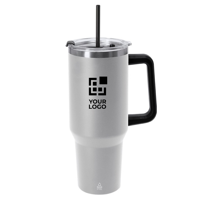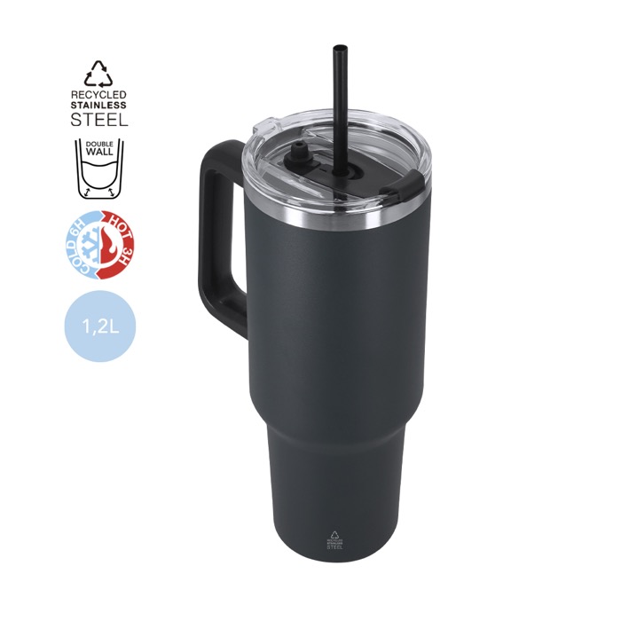 Tazza termica da 1,2 l di capacità. Realizzata in acciaio inox riciclato. Dotata di doppio sistema di bevuta: beccuccio con chiusura ermetica e cannuccia integrata, adattandosi alle preferenze duso. Include manico ergonomico in PP per un maggiore comfort. Senza BPA. Include targhetta in acciaio inox riciclato.