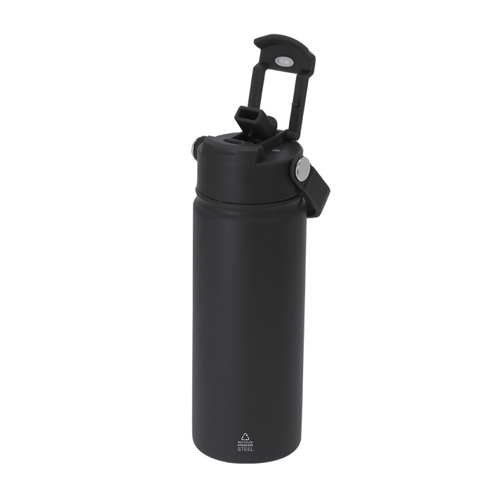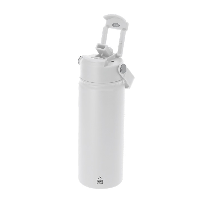 Bicchiere termico in acciaio inox riciclato con capacità di 550ml, pensato per l’uso quotidiano in ufficio, in viaggio o durante eventi. Integra un doppio sistema di bevuta per scegliere tra foro con chiusura ermetica o cannuccia integrata, a seconda del momento. Il coperchio con sigillatura ermetica aiuta a prevenire le fuoriuscite e il manico di trasporto facilita lo spostamento da un luogo all’altro. Senza BPA (bisfenolo A). Mantiene il caldo fino a 6h e il freddo fino a 15h, utile per attività di merchandising aziendale.