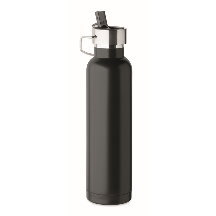 Borraccia a doppia parete isolata sottovuoto in acciaio inox riciclato (90% acciaio inox riciclato e 10% acciaio inox). Con cannuccia incorporata e manico nel tappo antifuga. Capacità: 660 ml.