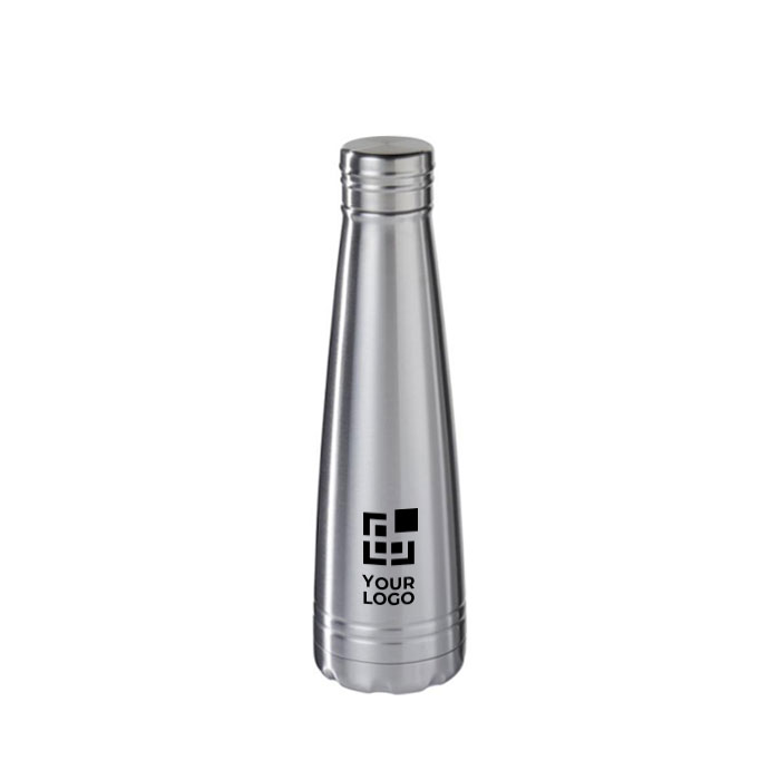 Bottiglia personalizzata, con parete doppio strato 18/8 gradi in acciaio inox con isolamento sottovuoto. L'interno della parete è placcata in rame che permette di mantenere fredde le bevande per almeno 12 ore. Capacità 500ml. Confezione regalo singola.