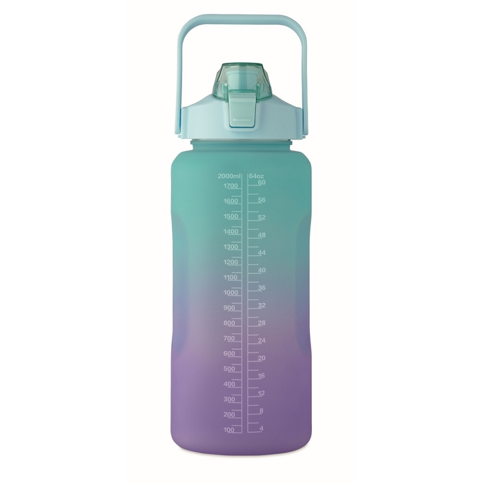 Bottiglia d’acqua in RPET con capacità di 2L, pensata per accompagnare le giornate lunghe. Integra un tappo a ribalta che si apre con una sola mano, cannuccia integrata e chiusura di sicurezza per evitare aperture accidentali. Il design antigoccia aiuta a trasportarla in zaino o valigetta senza preoccupazioni, e il manico facilita la presa e il trasporto. Opzione pratica per dotazioni interne, welcome kit o campagne aziendali di abitudini salutari.