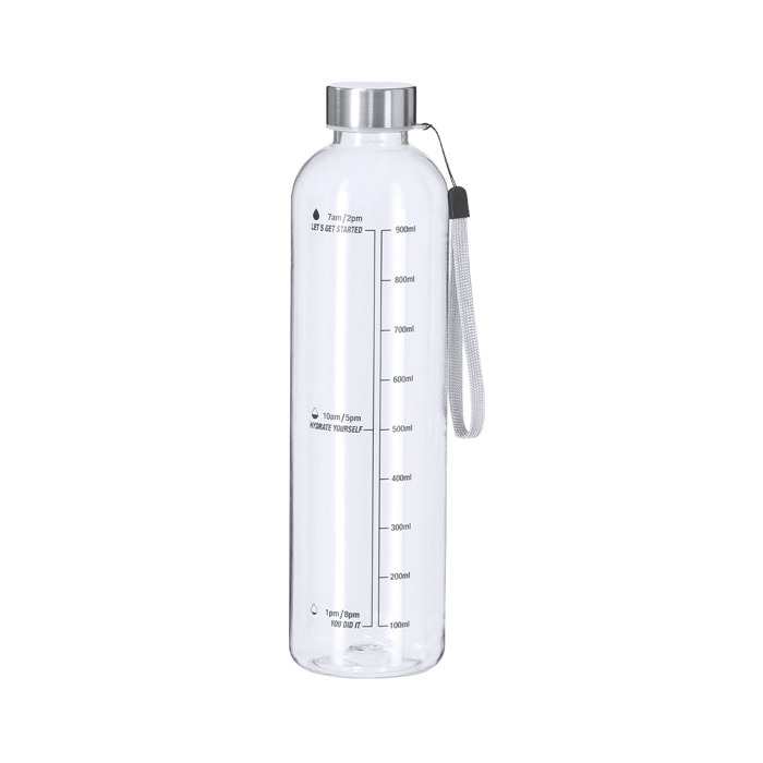 Borraccia realizzata in plastica riciclata, con capacità di 1 litro e corpo trasparente per controllare il consumo d’acqua durante la giornata. Include indicatore di capacità in litri e once, insieme a frasi motivazionali che aiutano a seguire una routine di idratazione costante. Il tappo in acciaio inossidabile garantisce una chiusura resistente e include un cordino per portarla comodamente a mano o appesa. Senza BPA, pensata per l’uso quotidiano in ufficio, in palestra o in eventi aziendali con personalizzazione.