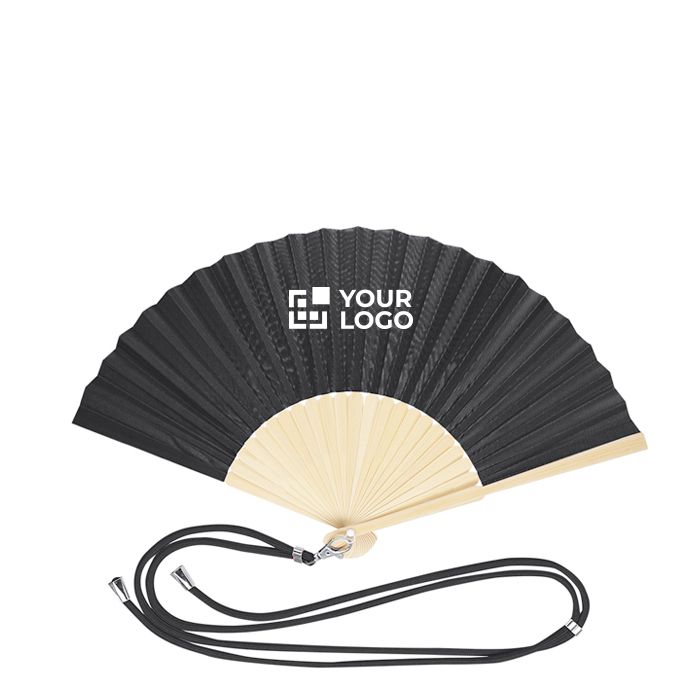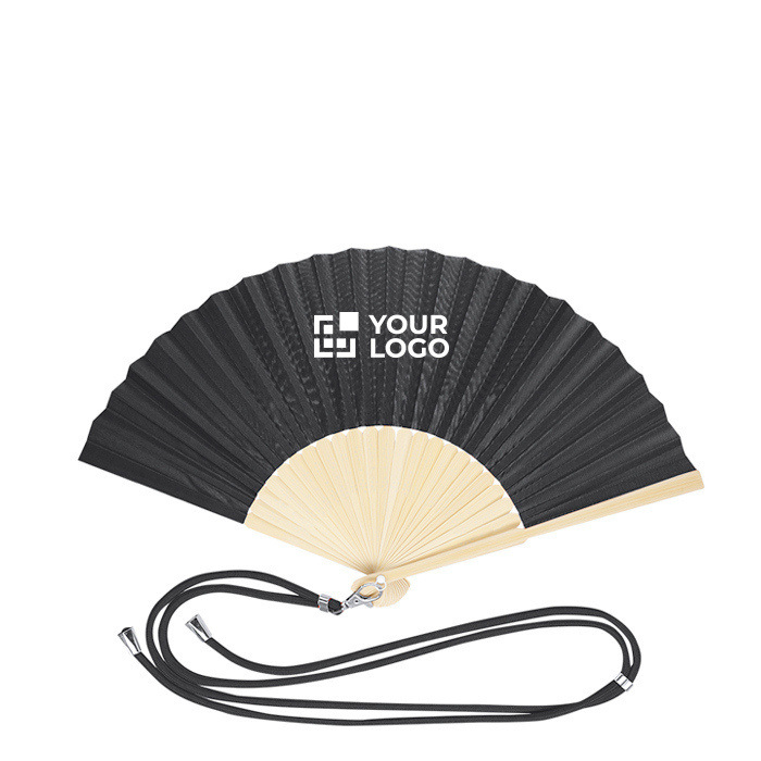 Ventaglio promozionale con cordino regolabile e moschettone metallico: lo appendi facilmente e lo distribuisci agli eventi con il tuo logo, mantenendo il brand sempre visibile.