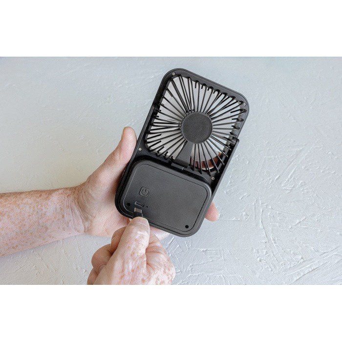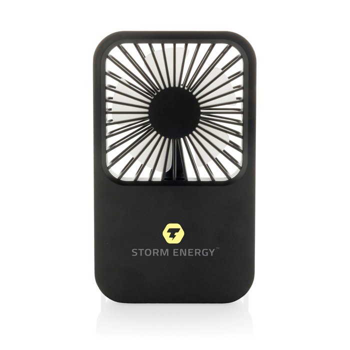 Ventilatore da scrivania realizzato in plastica riciclata, pensato per portare aria fresca in postazioni di lavoro, reception o sale riunioni. Include una batteria ricaricabile da 1200mAh con fino a 3 ore di utilizzo e ricarica approssimativa in 4 ore tramite cavo USB-A a USB-C incluso. Consente di regolare il flusso d’aria su tre livelli di velocità e di orientarlo grazie al supporto regolabile. Presentazione in scatola kraft con Certificazione di Sostenibilità Forestale (FSC). Una scelta pratica per attività di branding in ufficio o per eventi.