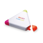 Questo evidenziatore triangolare è pratico e accattivante. Ha tre colori fluorescenti — giallo, fucsia e arancione — ognuno su una punta diversa. Per sottolineare, organizzare appunti o evidenziare informazioni importanti. La custodia è in plastica ABS, un materiale resistente e durevole. Facile da portare nello zaino o nell’astuccio. Un regalo promozionale utile e originale, ideale per eventi, fiere o campagne pubblicitarie. Disponibile in colore bianco. Puoi personalizzarlo con il tuo logo a colori. Hai bisogno della consegna rapida? È disponibile con servizio express!