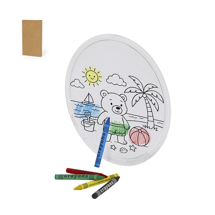Trasforma qualsiasi evento in un’attività partecipativa con questo frisbee da colorare con 5 pastelli a cera inclusi. Ideale per promozioni per bambini e iniziative dinamiche.