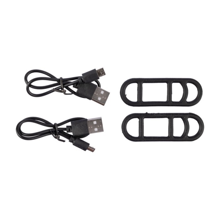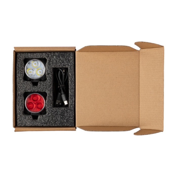 Set di due luci di sicurezza per bicicletta ricaricabili in ABS e silicone. Composto da una luce bianca per la parte anteriore e una luce rossa per la parte posteriore, dotate di 3 LED con 4 modalità di illuminazione. Capacità batteria da 650 mAh. Consegnato con cavetto di ricarica. Confezionato singolarmente in una scatola di cartone.