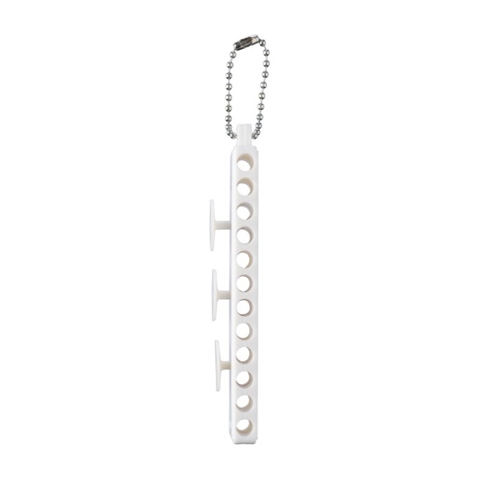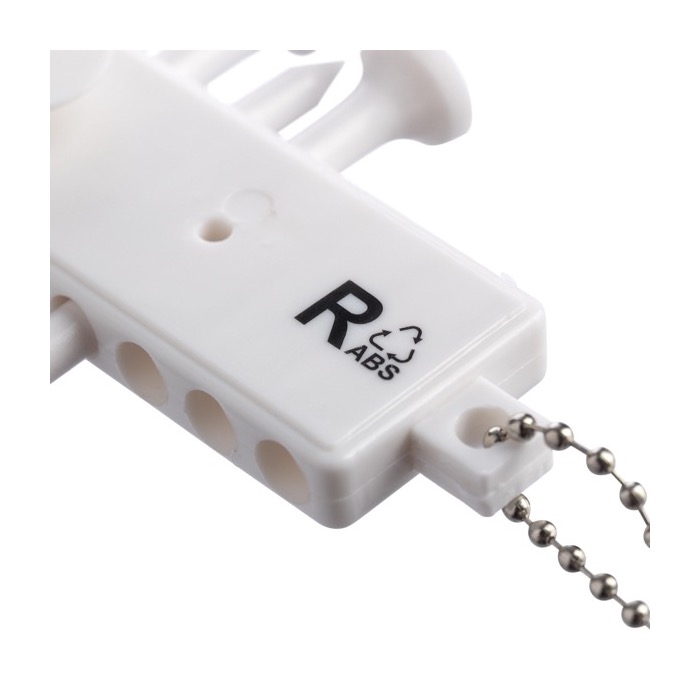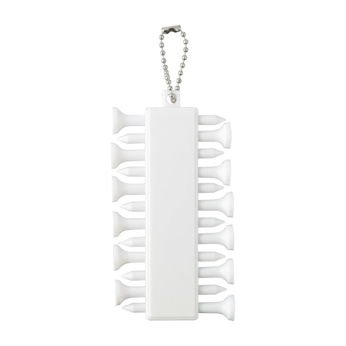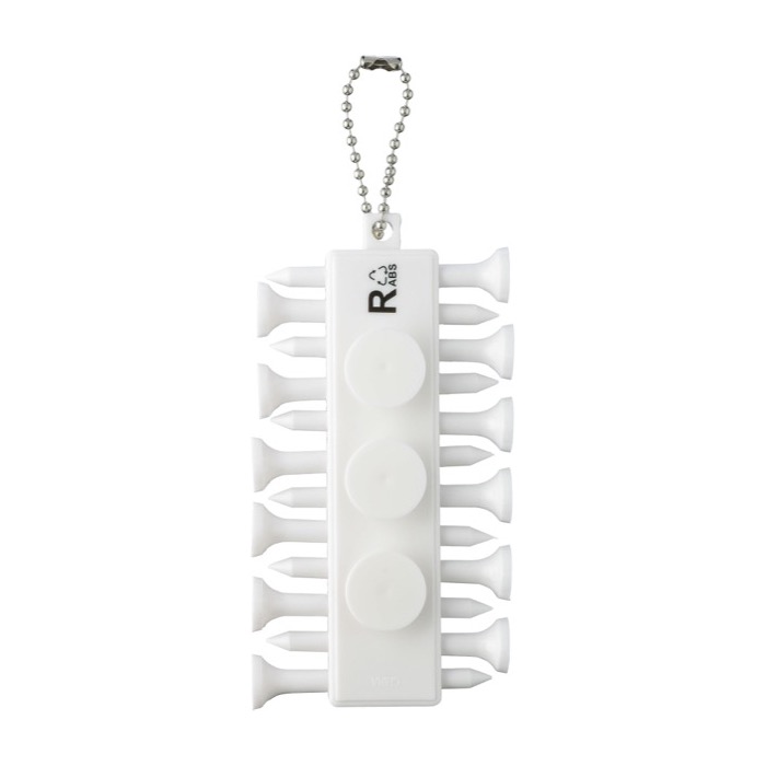 Set di tee da golf in ABS riciclato composto da 12 tee in un supporto compatto con tre indicatori sul retro. Presenta un cordino metallico per un facile fissaggio e include il logo ABS riciclato sul retro.