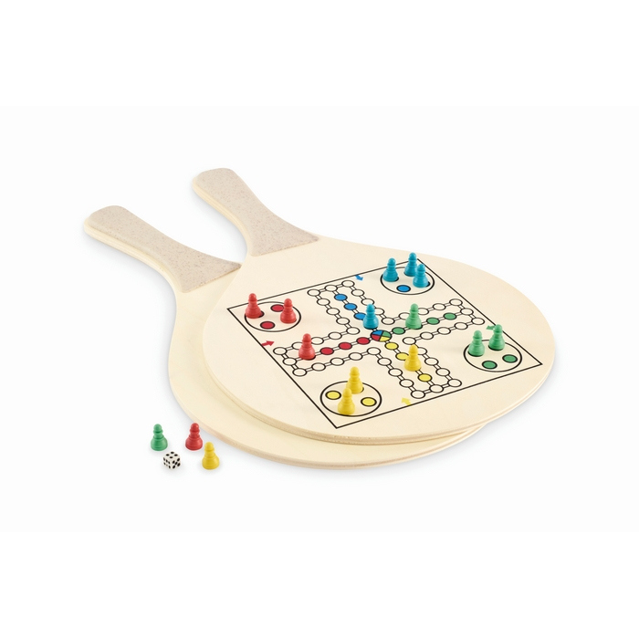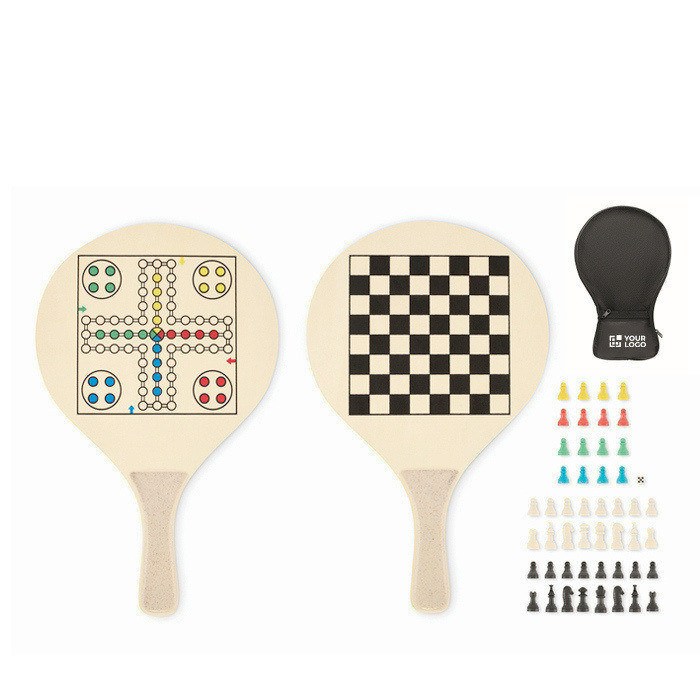 Set di racchette da spiaggia in compensato che integrano scacchiera e schema del gioco del Ludo. Include 1 pallina in TPR, oltre a dadi e pedine per completare le partite. Fornito in una borsa a rete RPET con cerniera, pratica per riporre e trasportare il set. Soluzione utile per azioni promozionali estive o eventi aziendali all’aperto.