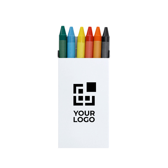 Set di 6 cere in colori assortiti presentato in una scatola di cartone riciclato bianca. Formato compatto da tenere a portata di mano in ufficio, in aula o negli spazi di accoglienza al pubblico. La scatola offre una superficie adatta alla stampa digitale, rendendo facile inserire logo, messaggio o grafica a colori con un buon livello di dettaglio. Una soluzione semplice per azioni di brand rivolte alle famiglie, campagne educative, eventi con attività e merchandising aziendale per fiere.