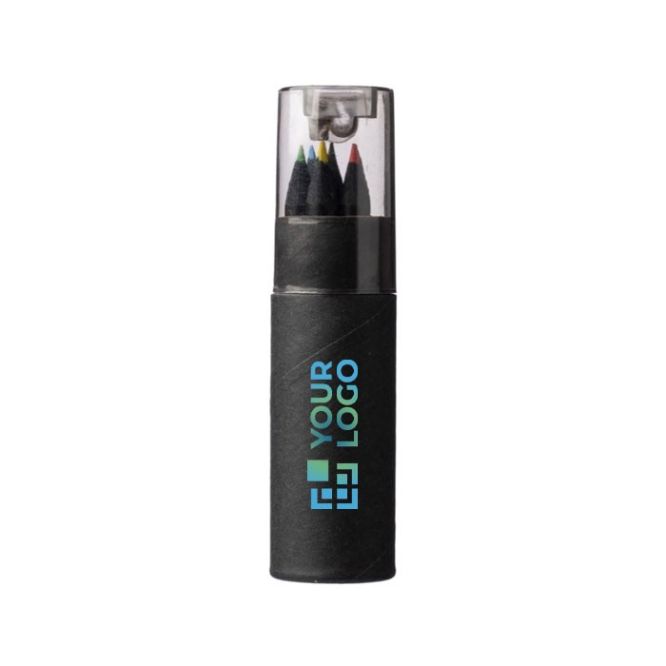 Tubo con 7 matite colorate e temperamatite integrato. Se devi fare pubblicità a un pubblico infantile e vuoi un articolo economico, scegli questo kit.