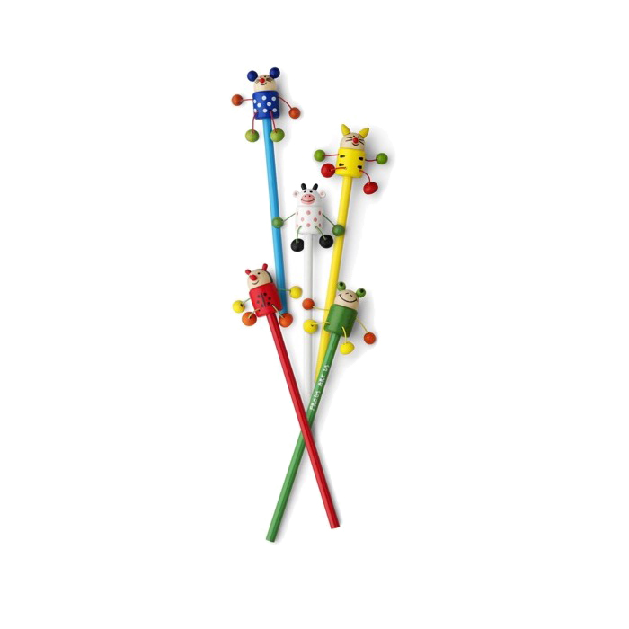 Matita in legno, 5 soggetti di animali (tigre, coccinella, topo, rana e mucca), non temperato, minimo ordine 50 pezzi assortiti in 10 pezzi per soggetto, prezzo cadauno.