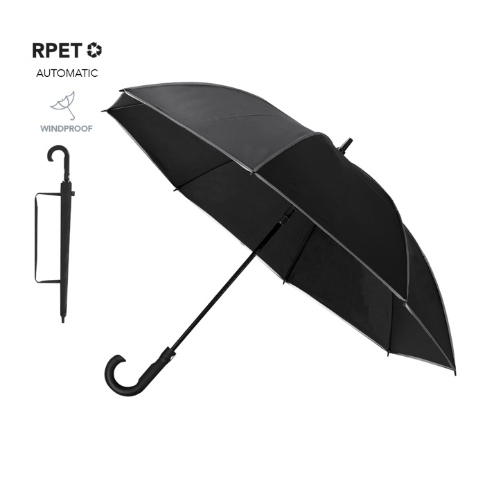 Ombrello antivento in plastica riciclata dal design nero con bordi catarifrangenti per migliorare la visibilità. Include 8 pannelli e un diametro di 120 cm, con apertura automatica e chiusura manuale per un utilizzo rapido negli spostamenti quotidiani. Le stecche in fibra di vetro offrono resistenza alle raffiche, mentre il tessuto pongee aiuta a respingere l’acqua. Include chiusura in velcro, manico curvo in plastica e custodia con tracolla regolabile per trasportarlo comodamente. Consigliato per attività di branding in eventi e per team commerciali.