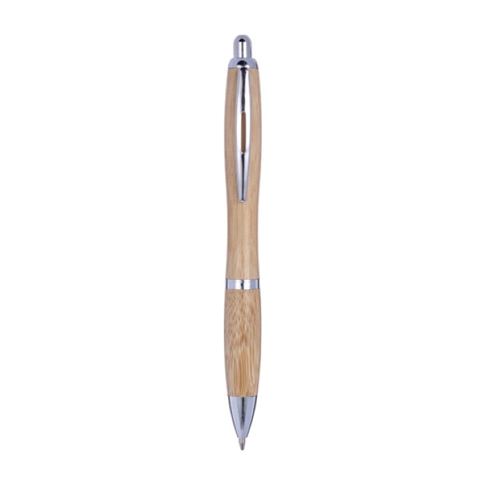 Classica penna promozionale con corpo in legno di bambù e dettagli in metallo, che puoi personalizzare con il tuo logo stampato a colori o inciso a laser.