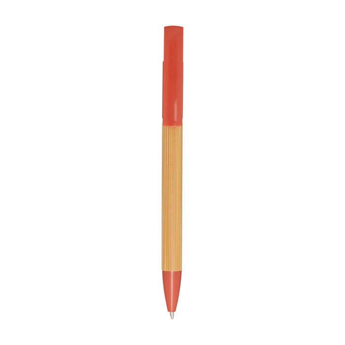 Penna a sfera in bambù con clip che funge anche da supporto per smartphone. Il pulsante e l'anello centrale sono in plastica riciclata, la punta è in ottone e il fusto è in bambù FSC proveniente da fonti responsabili. Inchiostro blu. Capacità di scrittura: 1000 metri. Dimensione del pennino: 1,0 mm.