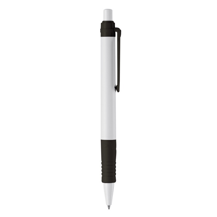 Penna bianca ecologica con dettagli colorati, inchiostro blu italiano.